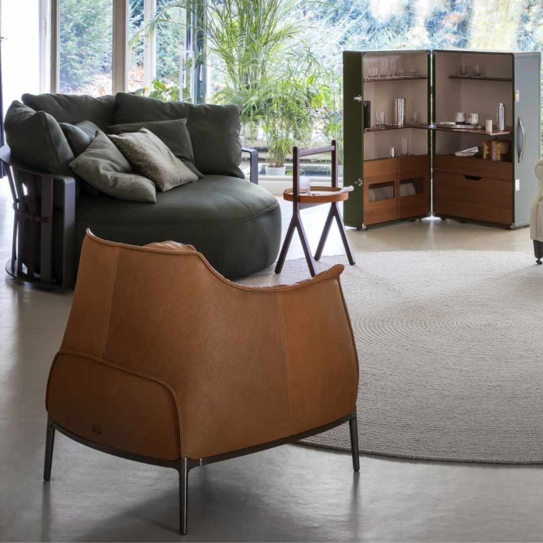 Archibald, conçu par Jean-Marie Massaud pour Poltrona Frau, est un fauteuil composé de quatre pieds en fonte d’aluminium reliés à une structure en acier tubulaire, disponible dans les finitions suivantes : gris gunmetal, bruni et titane. Il peut être revêtu de cuir ou de tissu. Coutures contrastées sur les bords et sur les surfaces extérieures du revêtement en cuir. Coutures ton sur ton pour la version en tissu.